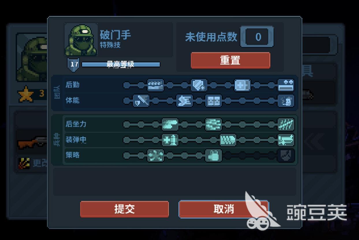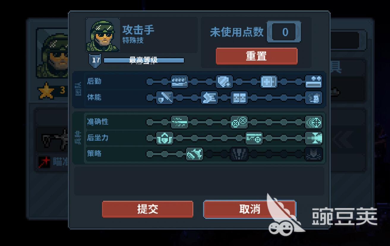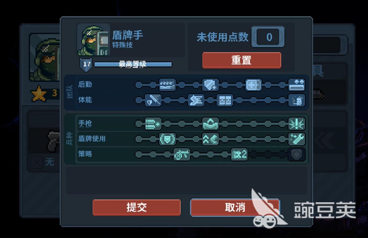 通用技能在细分有分成了后勤和体能,后勤技能必点双倍道具(3点),道具箱容量从2个增至4个,拆弹任务必备。防火服(6点)减少火焰伤害50%,对抗喷火兵很实用。尤其是打喷火BOSS,没有的话特别吃力。体能技能优先点出速度就是生命,移动速度+20%,顽强不屈(12点)降低濒死伤害30%,这个是毫无争议的高难度关卡必备,大家刚开始玩可以先不点,前面难度很低用不上。