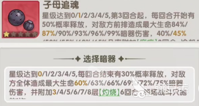 还有,子母追魂,唐门顶级暗器,以跟踪和爆发而出名,母胆射出后,子胆迅速分裂,可以对锁定的目标迅速展开攻击,星级达到0-5级时,从第三回合开始有50%的概率释放,对前排敌方能造成最大生命84%-99%的暗器伤害,40%-65%几率带有麻痹的作用在第2回合,到4回合直接冷却。这种暗器,对敌方是爆发式的击打,长时间的攻击,可使敌方出现麻痹,连续攻打能把敌方打倒,直到胜利,也是队伍作战中的必选之一。