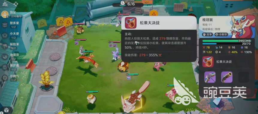 比如说一些加攻速,或者是在其他攻击效果上面得到足够提升的装备,都是可以利用它的属性带来足够加成效果的,利用攻击类方面属性为主的装备,大家都是可以给他进行搭配尝试的,目前外出的技能叫做松果大决战,这个技能是一个主动技能,使用的同时可以在释放的时候对敌人投掷一大枚松果,这里投掷出去的大松果可以造成的也是物理类型的伤害,并且造成的伤害达到了279点,此时还可以朝靠他最近的一个友方投掷一些小松果,这些小松果的能力则跟大松果不一样,他们是给友方单位带来增益效果的,这里增益效果是放在攻击速度上面可以带来50%的提升。