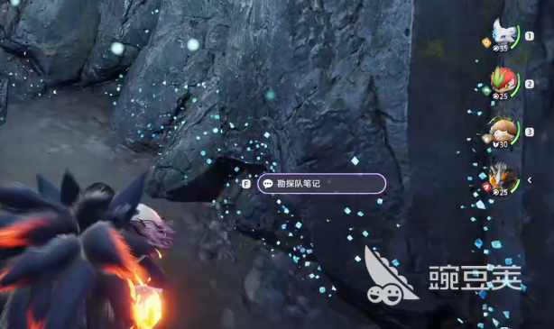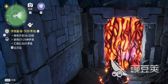 这扇门前面是有很多荆棘给门口挡住的,所以大家在这里直接使用小炭犬的技能效果,燃烧掉这里的荆棘,就可以进入其中,然后有一个能量收集需要大家做完,跟随亮起来的蓝色球型能量体就可以完成能量收集,随后开始探索大家首先遇到的会是碎岩仔,这里大家还可以收集到很多的土灵碎晶,其中有些宝箱的位置比较隐蔽,大家可能需要依靠不同的路线探索才可以进入其中,还有部分宝箱是藏在没有光照的石壁处,此类宝箱周边有一些蓝色的光晕特效会显露,大家可以依靠这些特效来找到宝箱。