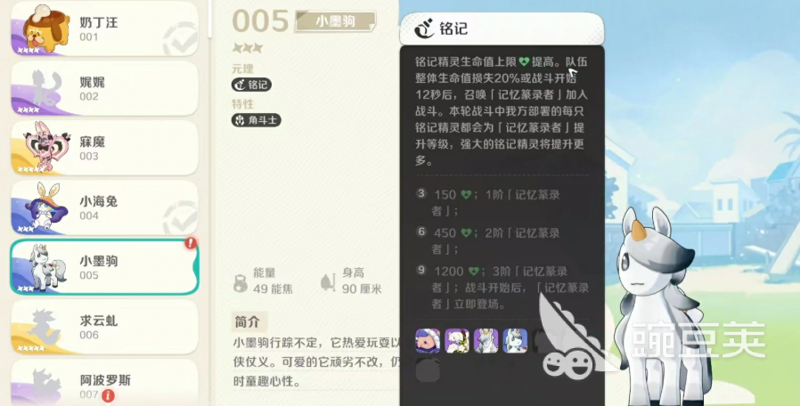 在搭配方面,其实大家如果走铭记路线的话,羁绊效果会更好触发一些,因为目前游戏当中铭记类型的宠物会比较多,如果在三个铭级精灵一起上线的话,带来的血量提升都能达到150点,这里的话带来的效果就已经足够强了,当然后期如果说大家想要为他进行此类特性羁绊的话,可以跟他搭配在一起的还有睡魔、框框蛇、银盐龟这些精灵,这些精灵跟他搭配在一起的话,达成的阵容效果就绝对是这类流派当中,比较适合前期用的。’