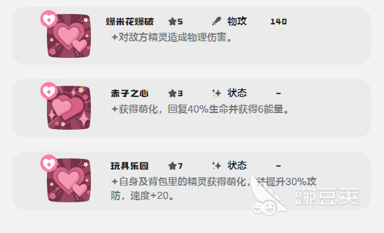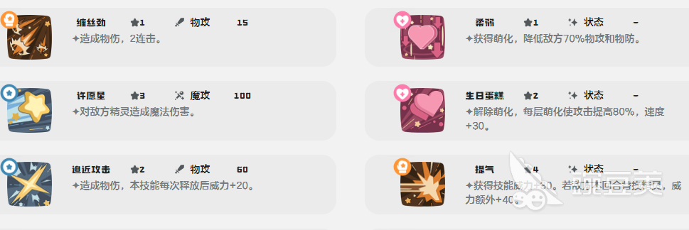 休息回复就可以直接回30%的血,作用于日常还是足够的。更厉害的是还有一个应激反应,普通的情况下大概就可以回25%的血,要是遇到对手防御反击,那就可以直接回80%的血。残血反打,那全部都需要靠他。另外还有一个赤子之心,不仅可以回40%的血,而且还可以获得6点能量。整体的性价比还是比较出色的,除此之外增益技能也是主要的亮点。柔弱可以把敌方的物理性攻击还有物理性防御直接下降70%就可以给我方创造出更多的机会。