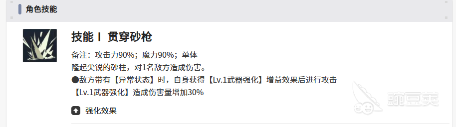 亚雷克德拉在技能当中有一个贯穿砂枪的技能,这个技能基础的攻击力能够达到90%,而在魔力上面能够达到90%,所以在基础攻击以及魔力输出上面能够达到的效果是比较平衡的,而且使用的输出目标是一个单体的目标,使用这个技能的时候,他会利用自己手中尖锐的沙柱进行输出,此时输出的话,除了基础的数值,还会根据敌方身上的状态来进行额外的判定,如果输出的时候选择的这个目标身上带有异常状态的话,那么亚雷克德拉他自身还会获得一个武器强化的效果,这个效果会作为一个增益来生效,后期他进行攻击的话,根据这个强化造成的攻击伤害数值会增加30%的数量,所以强化效果是非常不错的,特别是在攻击定位上面本身就需要攻击力加成的情况下,这个技能是可以放在新手的时候使用的。