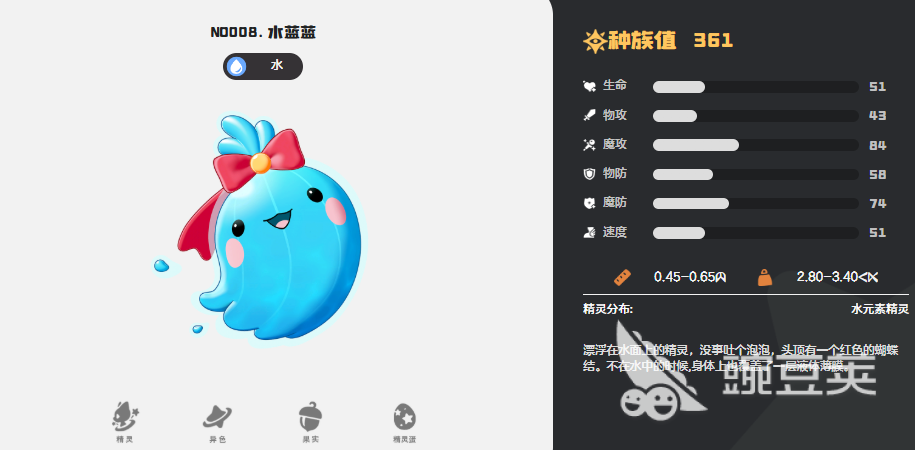 第三个则是其中的水蓝蓝,这是目前水属性当中一个控制能力非常不错的精灵,它放在队伍当中其实是可以掌控整体节奏的,这个角色在特性上面有一个浸润的机制,也是水属性当中比较常见的,也就是说他使用一些水属性的技能击中了敌人之后,还可以降低敌人身上的攻速,在达成了20%降低攻速之后,它后期还可以根据这个百分比来进行叠加,一直达到50%的影响上,就无法再进行叠加了。