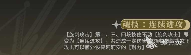 所以这里的话,她在蓄能的机制上面并没有很强大的压力,而且她本身的持续作战能力,还可以用这样的蓄能效果来带来足够的提升,那么后期通过激活的魂技效果,其实力量也可以开启自己的魂技,她的魂技技能是可以利用自身的普攻技能转化为一个旋剑的状态,这个旋剑状态也可以使用,这个形态带来的增益是作用在她使用普攻的时候,除了第一击是基础的攻击之外,后面连续的连招次数都可以变成一个强化的攻击效果。