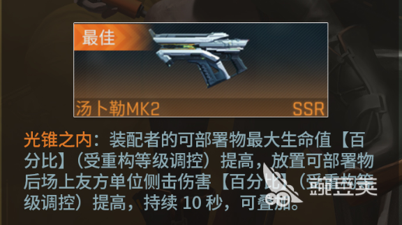 在经过实际测试之后发现比较合适的武器就是汤卜勒MK2,这把武器主要的核心是可以通过重构等级,去有效提升最大生命值的百分比。让角色放置的掩体还有器械会拥有更高的抵抗力,可以避免刚刚落地就直接被敌人摧毁。更关键的是在每一次放置之后,还可以给场上所有的我方成员叠加侧击伤害百分比。不管是搭配狙击位还是突击位,都可以在短时间内提升队伍的爆发能力。
