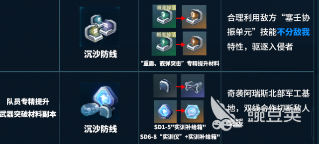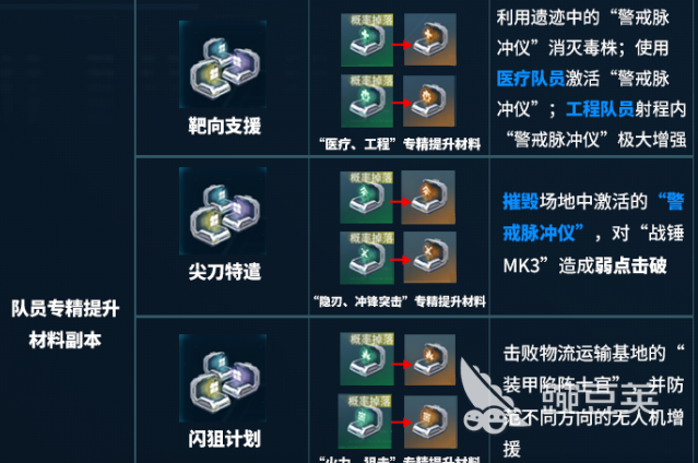 另外玩家还可以去关注深红武装副本,这里就是培养武器的所在之地。主要的获取材料就是武器兑换币,还有模组数据单元以及活性合金锻料。前两者是更换武器,还有刷模主词条的关键,后者就是工程职业在提升专精时的必要材料。想要给队伍配强力的武器,想要养医疗队员,那这个副本必须要刷满。接着就是职业专精材料本产出完全是对应自己的职业,所以千万不要搞混合。靶向支援副本就可以获得影刃职业,还有冲锋突击职业的专精提升材料。