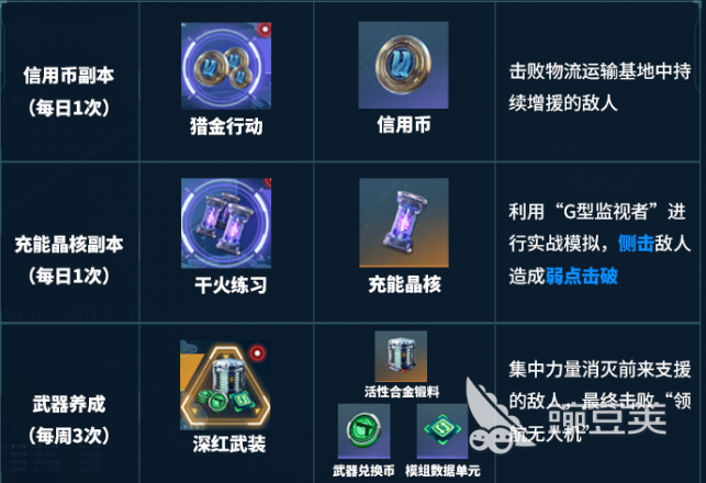可以先看一下每日必须要刷的日常基础副本,这里就是获取基础资源的关键,每天只有一次机会,千万不要错过。如在信用币副本中就可以获得大量的信用币,这就是游戏中通用的货币资源,不管是升级队员还是购买基础的材料,全部都可以获取。第2个自然就是充能晶核副本专属产出就是充能晶核。这个道具也很关键,是队员在提升天赋时的一种核心材料。天赋的等级就会直接影响到技能强度,想要让主力队员去发挥实力,那每天都需要去打上一圈。