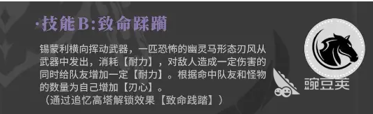狂气深渊这属于一个突进技能,侧身冲击之后连接横斩就可以迅速的贴近敌人,还可以通过三段伤害直接打满爆发。更重要的是一旦命中敌人破绽时,马上就可以触发一个开刃的状态,这一个状态就是后续强化输出的关键。还是高手玩家必争的战斗节点,后续就可以通过追忆高塔去解锁绝命深渊,还有绝命炼狱。在面对boss时就可以轻松的打出巨额的伤害。致命蹂躏体现出他的团队价值,在横向挥出技能之后,不仅可以给敌人造成伤害,而且还可以给队友补充耐力。命中的队友或者是怪物的数量越多,那么所获得的刃心也就越多。