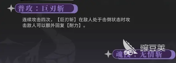 巨刃斩是普通攻击,4次连续挥砍看上去很基础,但是只要敌人处于击倒的状态,那就会额外的回复耐力。耐力正好是他释放核心技能的关键,这个设定让他在压制敌人时就可以一直保持战斗的节奏。普通攻击在打出第2段第3段的时候就可以直接切换成无情斩,不仅伤害可以提升,在攻击倒地敌人时还可以恢复耐力。这就意味着掌握节奏之后,他就可以在普通攻击,还有魂技之间无缝的衔接,在应对成群结队的敌人时就很有优势。