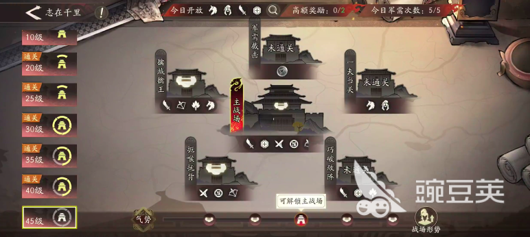 目前该板块的战场关卡等级已经达到了50级,但因为文章篇幅有限,所以小编就先将一些高难度关卡的通关攻略在文章当中进行分享,本期要分享的是45集的颜良文丑关卡,首先在文章开始,小编想先介绍一下“志在千里”的机制,一个战场里有5大分战场和1个主战场,当玩家通过3个分战场后,就可以开启主战场关卡,最值得一提的是,如果开启了主战场之后,玩家能够继续打其他战场,是会给主战场降低难度的,所以建议玩家先通过5个分战场,再进入主战场进行资源收集。