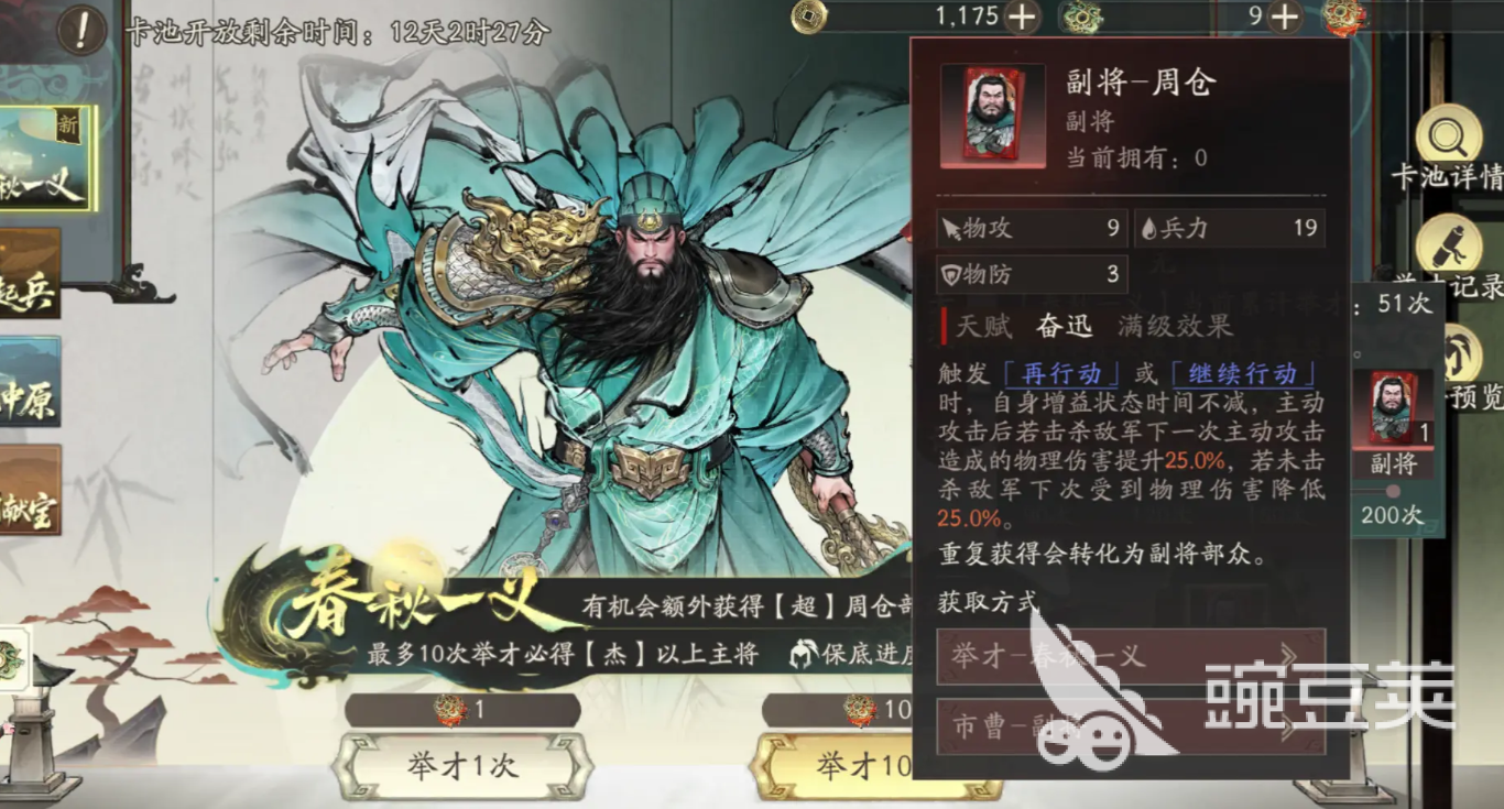 周仓在游戏当中是顶级副将,他的基础物理攻击为九点,兵力为十九点,物理防御为三点,天赋效果奋迅,在满级状态时,可以触发再行动或者是继续行动,再行动效果是,主将单位可以获取一次新的行动机会,继续行动指的是在回合结束之前,可以直接利用剩余的移动力,继续令主将单位行动。