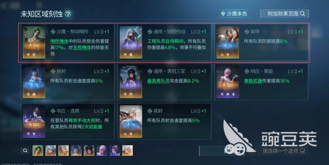 模组激活之后,属性加成的Buff大概分成三层,基础Buff,词条Buff,属性加成效果不同。基础Buff不需要任何条件就能生效,像“游击防卫队”“沙海守望者”这样的buff直接给全队带来通用的增益效果。词条Buff依照品质划分成专属,通用和常规三种,专属词条加成最高,比较适合关键的核心角色。通用词条常规词条最少,属性加成Buff更加有针对性,包含对特定职业队员或者单独角色的攻击、生命、防御加成。玩家激活Buff之后,可以根据实际的队伍和战场需求来灵活挑选加成类型,从而提升整个队伍的作战效率。