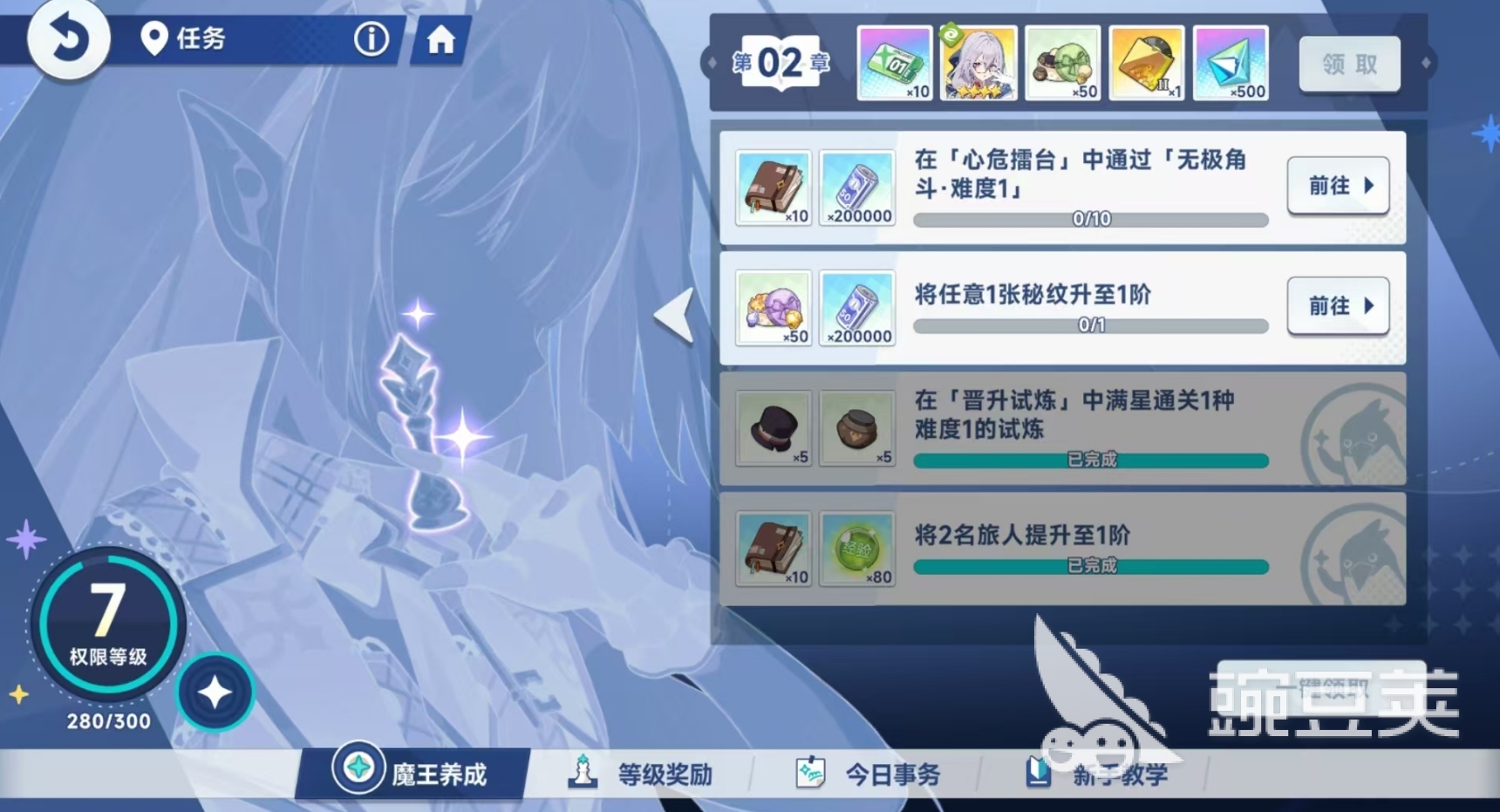 其三是在魔王养成界面完成里边的各项任务来获取权限经验,它里边有多个不同章节的魔王任务供人们去完成,任务难度也不大,即便是战斗任务也只需打最低难度的副本就可达成任务目标。并且每一章节的魔王养成任务都完成后,还能领取到极为丰厚的奖励,回报率非常高,很值得玩家优先去进行。此外,当玩家通过获取权限经验完成权限等级的提升后,还可在等级奖励界面中领取权限等级奖励,例如星之砂、体力药等物品,都是较为珍稀的资源,各位在完成权限等级的提升后,记得去将它们拿到手。