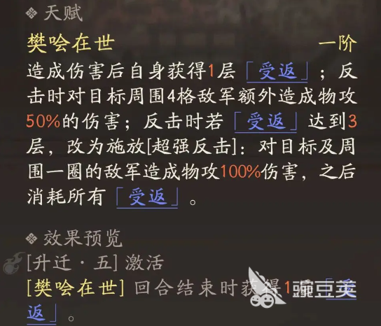 和他比较相似的还有典韦,主要是靠被动打输出。天赋万夫不当可以在受到主动单体攻击之后,对于4格范围内的伤害来源直接产生无视75%防御的物理性攻击伤害。不过典韦在使用时也有一个问题,被动输出如果想要拉满的话,那自然就需要合理的站位,以及队友。和主动的输出角色比较,在使用时反馈可能会有一些欠缺火候。一格阻挡领域加上20%的分摊伤害,整体来看也并不是很强势,强度评级就在第一到第二之间。