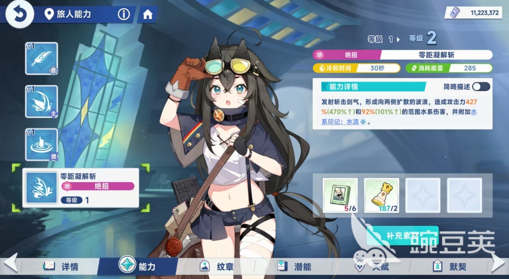 特丽莎一般不会出现在主控位置,援助位才是她最好的就业空间,因此在养成时,各位只需去提高她的援助技能和绝招即可,普攻与主控技完全不用升级。释放援助技能时,特丽莎会将自己的魔剑插在地上,并生成一片能对敌人造成伤害的浪域,浪域内的敌人还会被添加水系印记。同时,主控角色也会获得基于特丽莎攻击力的涌盾,在敌人对主控角色进行攻击时,它打出的伤害会优先被涌盾吸收,若伤害超过涌盾的上限,则剩下的伤害才会打在主控角色身上。