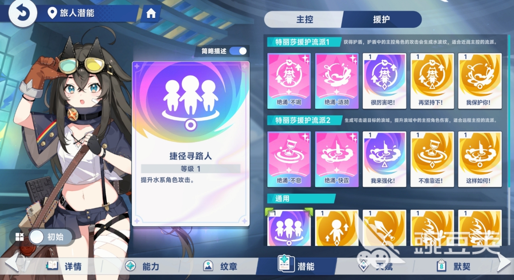 其中,若是特丽莎走涌盾流,不光能让获得涌盾的主控享受到额外的伤害加成,它还能生成额外的水波,帮主控补足伤害,只不过该效果需近距离触发,所以也让涌盾流更适合搭配近战水系主控。若是让特丽莎走浪涌流,那么生成的波浪会拥有能将敌人推开的效果,可很好地帮主控击退近身的敌人,这也让浪涌流更适合与远程水系主控搭配,令她的生存能力变得更强。此外,不管特丽莎走哪一种潜能流派,捷径猎人这一潜能效果最好都拿到,它能让队伍里所有的水系角色都可获得攻击提升,很泛用。