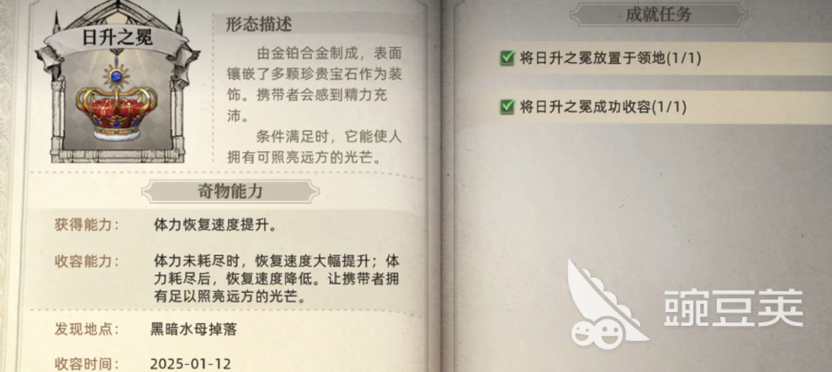 其次,皇冠还可以帮助你加速体力恢复。你知道,在《荒原曙光》里,体力是非常重要的,尤其是在那些长期探险的过程中,体力耗尽意味着你几乎没有什么应对能力。而皇冠的体力恢复加速效果能帮助你在体力没有完全耗尽时,大幅提高恢复速度,几乎能让你恢复得比正常情况快一倍。这对那些长时间在黑暗中摸索的玩家来说,可以说是一个福音,省去了不少时间。