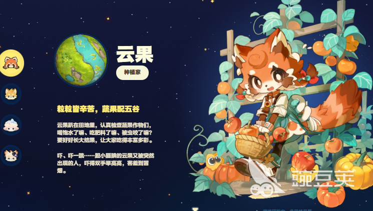 云果是星布谷地中最常出现在田间的身影,一身便于劳作的浅褐布衣上总沾着些泥土与草屑,身后那条蓬松的橙色狐尾偶尔会轻轻扫过脚边的作物,像是在无声地安抚这些幼苗,每天清晨天刚亮,她就会提着藤编小篮穿梭在田埂间,弯腰拨开叶片仔细查看每一株植物的状态,指尖拂过叶片时若发现虫害痕迹,便会立刻从篮中取出自制的天然驱虫剂,动作轻柔又专注。