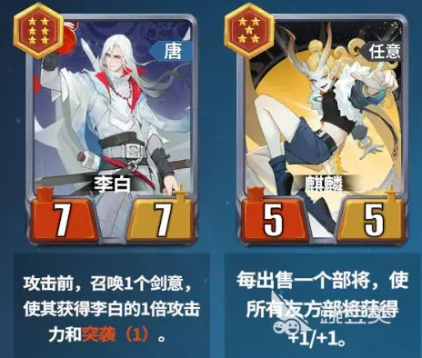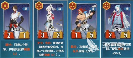 一开始如果想作用于过度,可以选择北衙禁军,本身的战斗力不俗,在进入到中后期之后还可以触发鼓舞,这就是一开始比较实用的打工卡牌,直接上阵是没有错的。在进入到中期成型过渡时,就可以选择将长孙无忌还有程咬金搭配在一起。然后用李秀宁去吸引攻击,就能够直接触发程咬金的效果,让他可以迅速的成长。如果没有抽到李秀领也没什么关系,可以直接给长孙无忌上一个夜巡加上护卫。在进入到后期有两个思路可以选择,一个是以李白为主,一个是以麒麟为主。