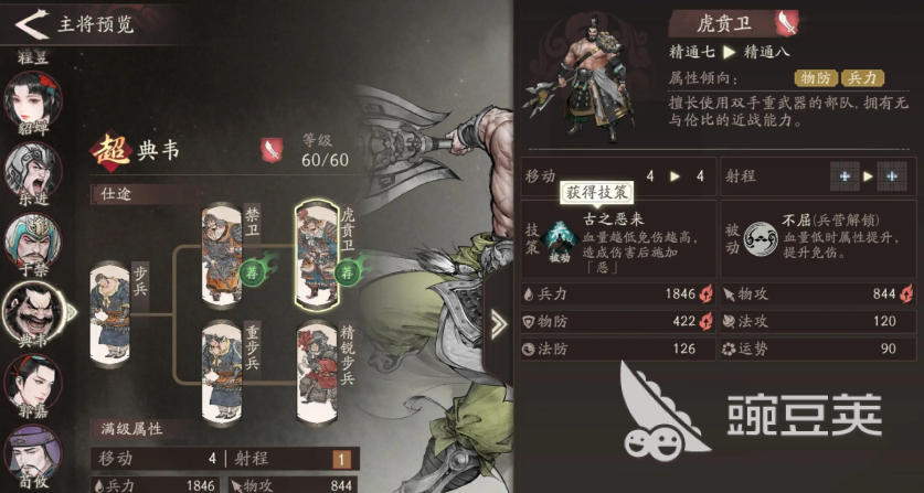 作为步兵型的武将之一,典韦被大家视为前排肉盾最合适的新手机人选了。除了可以作为一个肉盾角色,辅助队友一起输出之外,在近战方面也有着卓越的能力,可以近距离的给敌人造成很强的伤害,直接让敌人处于一个强掉血的状态。天赋万夫不当释放后则会使普攻射程有所提升,若处于对敌人的反击状态,同样能够增加至35%的追击伤害。