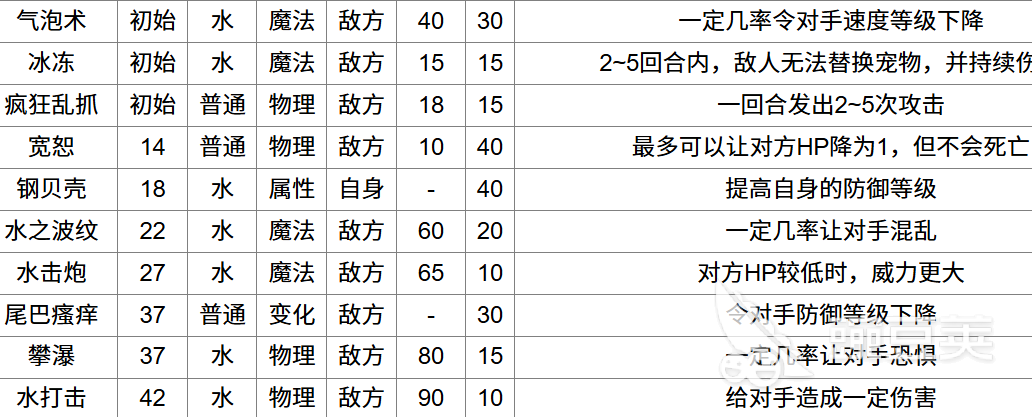 宽恕这个技能虽然是普通的物理攻击技能,这个技能最有一个关键的用处就能能够把对方的hp下降到1点,尾巴瘙痒则是能够使对方的防御等级下降,攀瀑会有一定的几率让玩家陷入到恐惧之中,水打击则能够给敌人造成90点的伤害,这一套技能主打的就是先降低敌方的防御和hp,让敌人陷入到恐惧在进行收割。