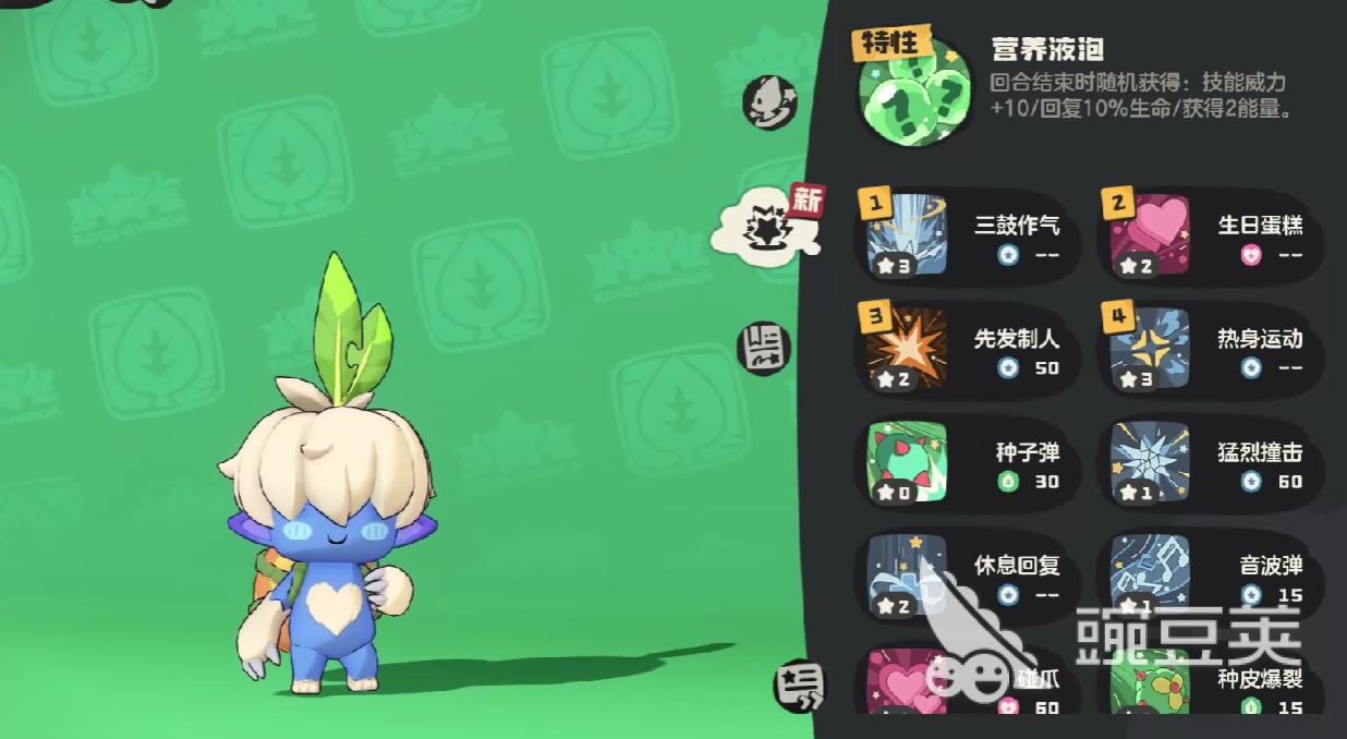 舞动路路的特性是“营养液泡”,在回合结束时,可以随机获取技能威力加十、回复10%的生命数值、获得两点能量的效果,该特性可以为舞动路路提供续航能力,同时,它附带的主要技能有三鼓作气、生日蛋糕、先发制人、热身运动。