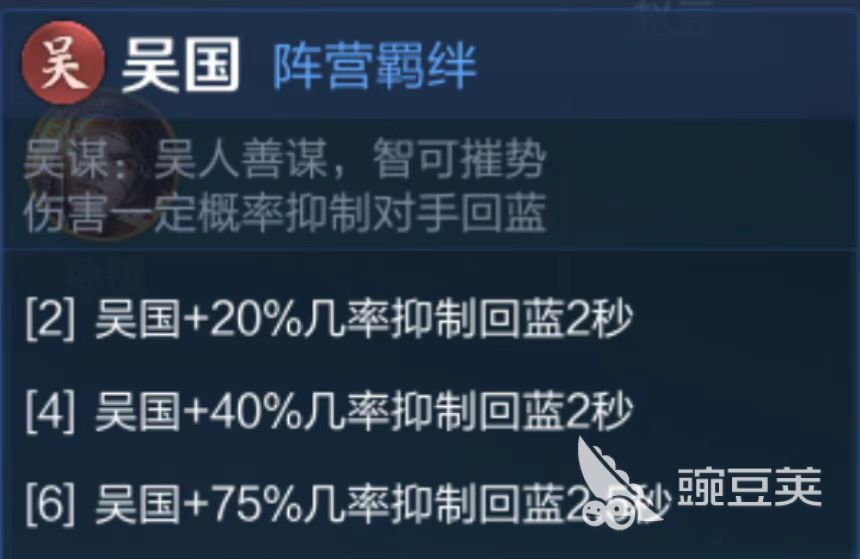 游戏当中吴国的羁绊通常不是最为强势的,但却是游戏中针对性最强的羁绊。凑齐6位吴国阵营的角色,那么吴国角色在对敌人造成伤害的时候,就有75%的概率抑制敌人的蓝量回复持续2.5秒钟。该羁绊虽然在游戏起初效果并不明显,咋一看并不如蜀国和魏国的羁绊效果,但是随着战斗时间的持续增加,当敌人的蓝量消耗一空时,或者应对法师多的阵容,吴国的羁绊却是非常强大的存在。