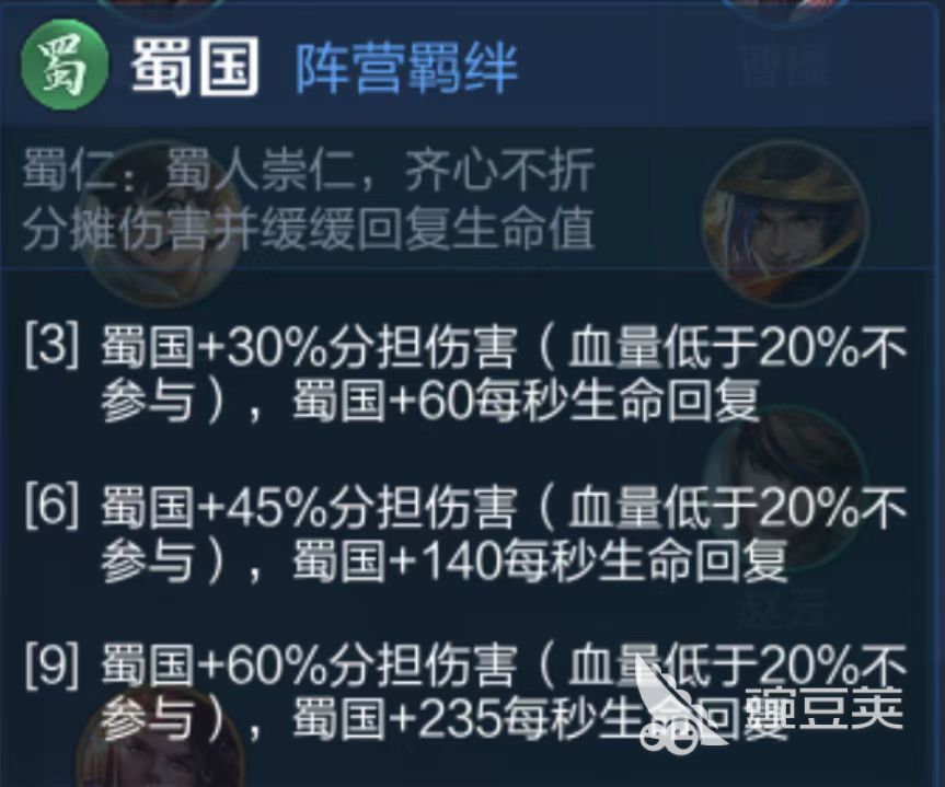 羁绊和阵营比较类似,但是和阵营却全然不同。目前游戏当中一共有四种羁绊,分别是魏蜀吴和长安。游戏当中的羁绊共有三个等级,羁绊等级越高,获得的加成也就越强,提升羁绊等级的唯一方式,就是让相同阵营的英雄上阵。蜀国的阵营羁绊将会给全体蜀国角色,带来高额的生命回复效果和伤害分摊能力。当蜀国9位角色全部上阵,那么蜀国的角色每秒就会恢复235点体力值,并且将自身受到伤害的60%十分摊给其他全部的蜀国队友。