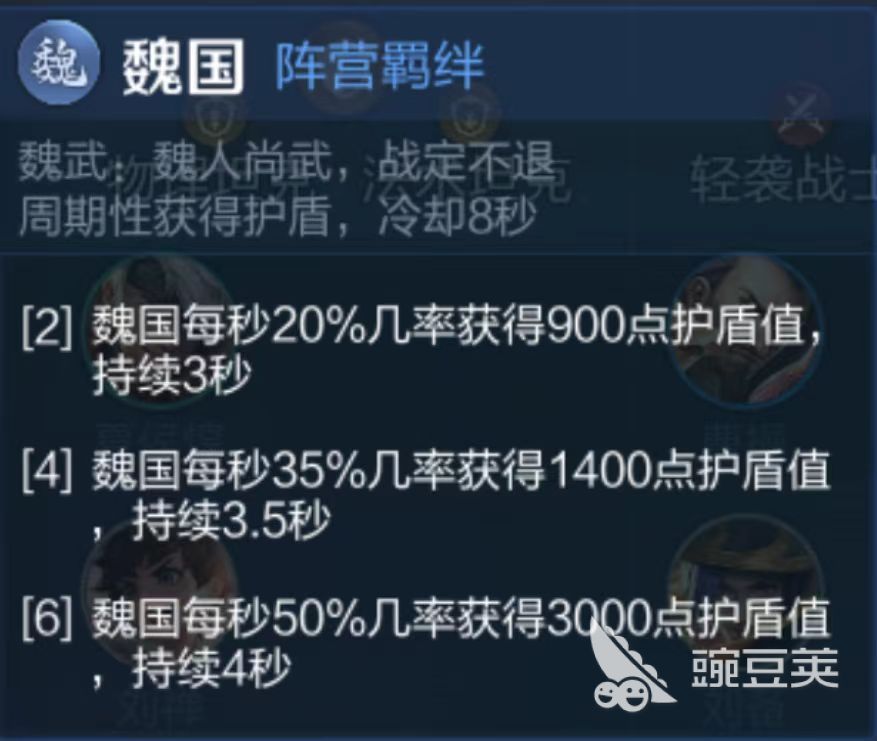 魏国的阵营羁绊也是游戏当中非常强势的,凑齐两名魏国角色,魏国的羁绊就会生效。每秒钟都有20%的概率获取900点护盾,护盾确实还不错,但是概率却却并没有很高,一场战斗下来触发的次数还是非常有限的。但是当玩家们上阵六名魏国角色的时候,魏国所有角色每秒钟就有50%的概率获取3000点护盾了,并且这个护盾还可以持续4秒钟,可以说是非常的强势了。