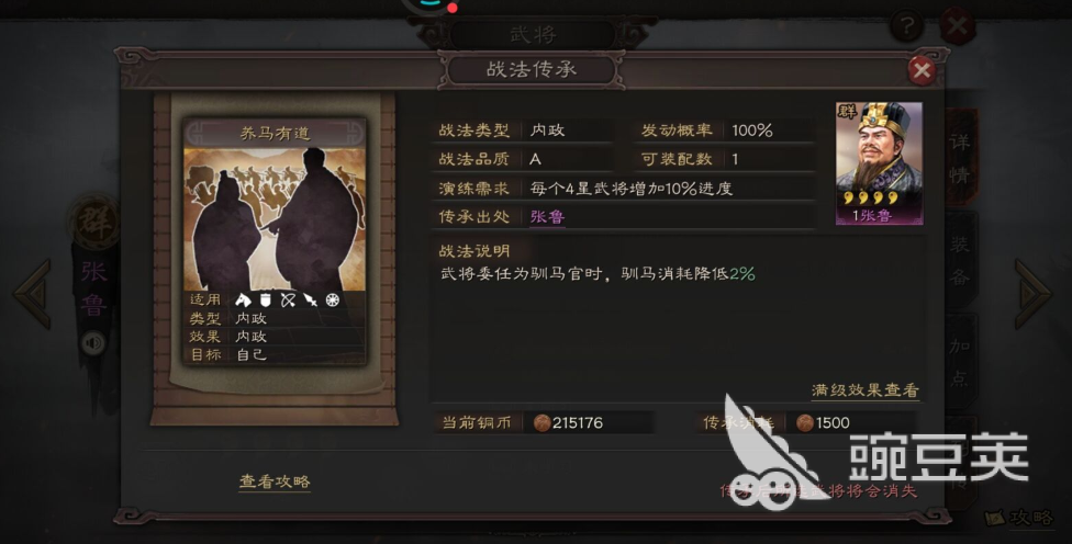 从技能的角度看,张鲁的养马有道战法表面上来看是委任和后勤,但是在一些副本战斗中有时会体现为“降低敌方出征效率”或者“减少士气消耗”,使玩家在持久战中容易处于被动地位。因此对抗张鲁的主要策略就是速战速决。推荐使用张飞的“燕人咆哮”、关羽的“青龙偃月”或者诸葛亮的“八阵图”等带有强控和爆发的战法,用高频输出和控制相结合的方式打断张鲁的防守节奏。