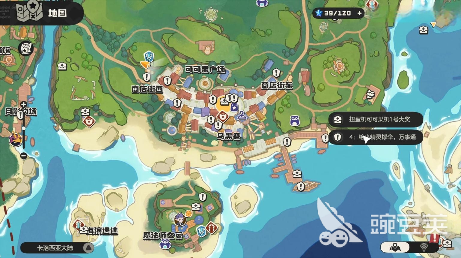 位于可可果广场附近的互动任务也十分有趣,例如“为小精灵撑伞”这一活动,只需与NPC对话并按要求操作即可完成,成功后将解锁成就并领取奖励。此外,部分场景任务需要携带特定精灵参与,比如通过敲击鼓类机关来完成挑战,最终打开宝箱获取道具。