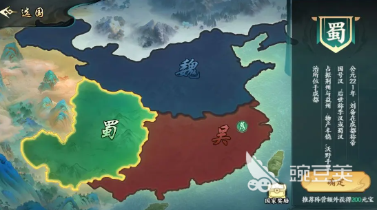 玩家在通关主线9-410之后,马上就可以解锁选国家的功能,在开服的第1天就可以加入到任意一个阵容。蜀国立国成都长时间占据荆州这里的物产还是比较丰富的。在选对阵营之后,玩家还可以拿到200元宝,所以在开局时就可以直接领先其他人。在选好国家之后,玩家就需要注重于组建征战群团,每一个主公就只能够调遣5名将领,每一个将领都可以单独带领一队兵马,在合理搭配之后,就可以发挥出最大的战斗力。