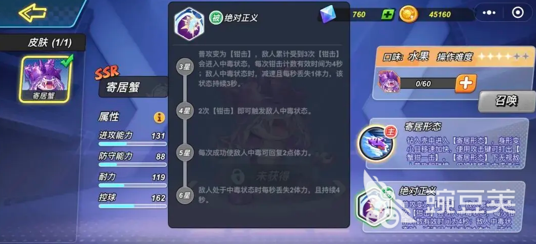 还有一点也很有意思,就是寄居蟹的被动技能【绝对正义】。它解锁了之后,三次普攻就能让敌人中毒,敌人中了毒之后会变得很慢,而且会失去一些血量,这样就能给对手带来很大的麻烦。到了四星,效果会更强,普攻两下就能让敌人中毒。虽然你可能会遇到一些高手,他们跳跃和冲刺都很厉害,可能就不容易让你触发这个技能,但还是可以找机会去使用,像敌人扣篮之后,刚落地的时候会有一点点的空隙,这时候你就可以趁机普攻,给敌人中毒,再找机会进攻。