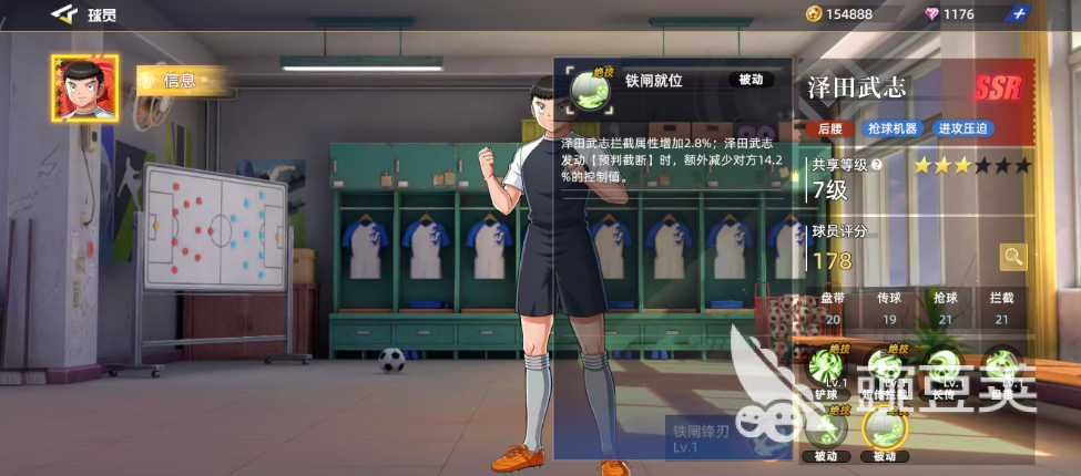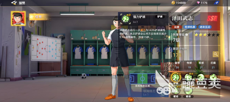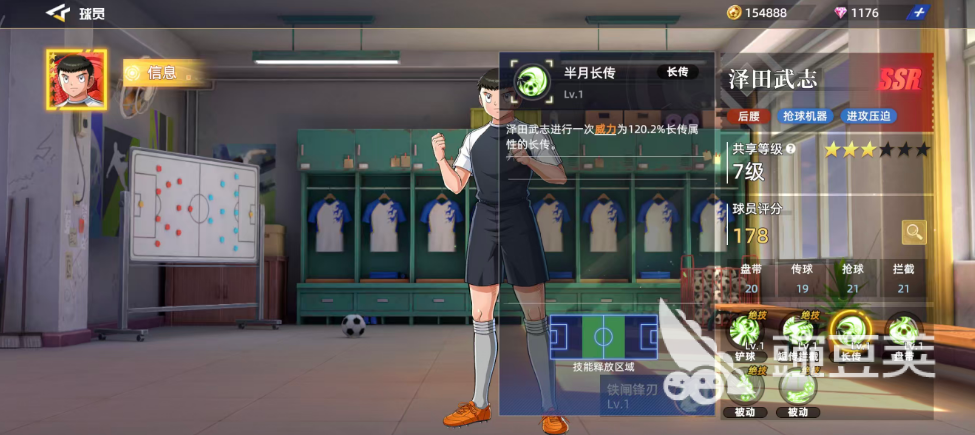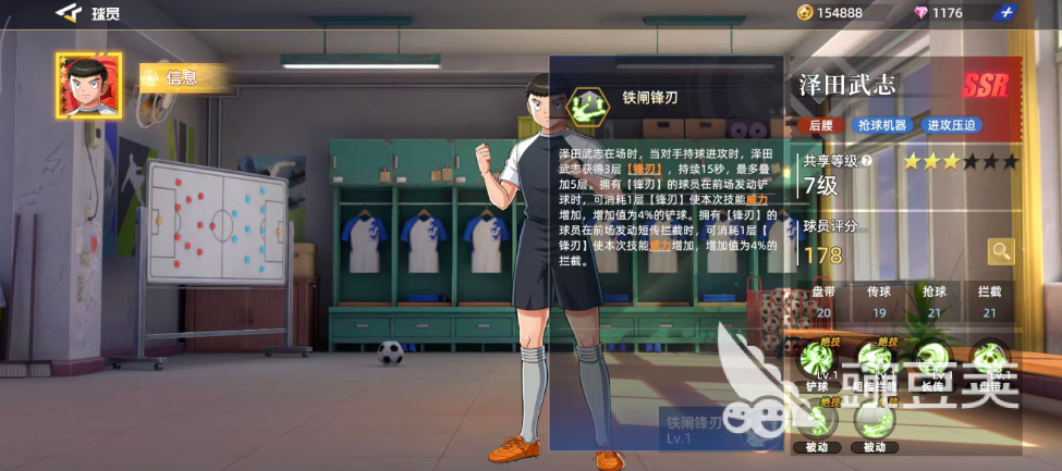 泽田武志是游戏中达到了红色品质的5SR球员卡,可以作为后腰角色用,抢球机器以及进攻压迫都是非常不错的,盘带数值20、传球19、抢球21加上拦截21,基础的分值比SR强度的球员高很多,球员评分也达到了178,他最高的一个总评价是预判的能力,达到了29分,快接近30的评分是非常不错的,而在高级属性上面短传跟长传也达到了19的分值,包括在低空抢点以及高空抢点上面也有16点的数值。