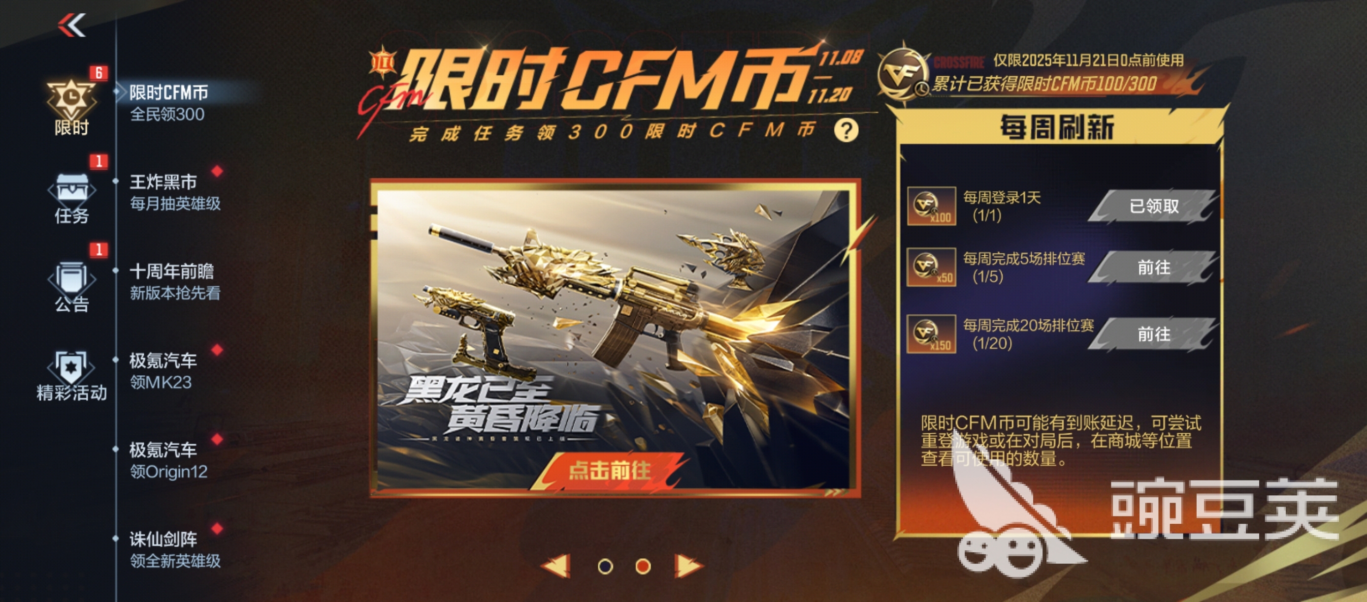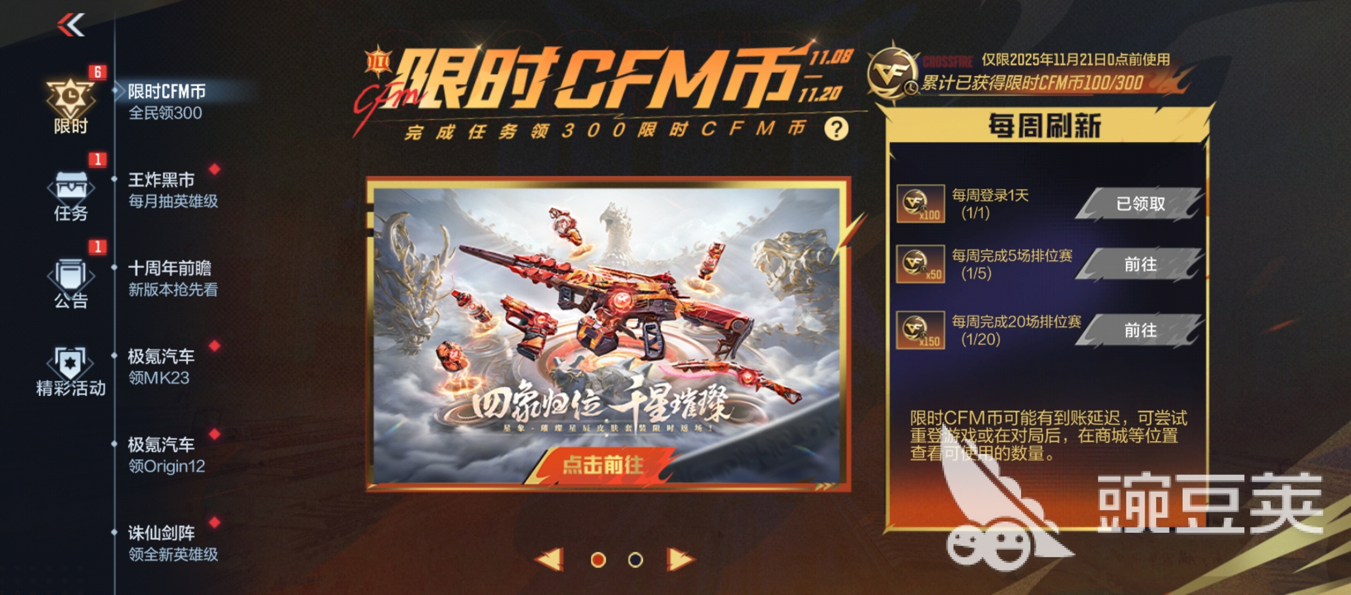 玩家想要获取cfm币,主要是参加官方活动,比如,在2025年11月8日开始的限时活动当中,玩家只需要完成登录的任务和指定数量的排位赛。这时候就能够获得300限时cfm币,这个是玩家目前获取cfm币的最好的方法,毕竟玩家获取cfm币之后,可以利用它来购买悬赏令,参与抽奖活动,在整个游戏当中会涉及到较多的武器玩家也能够参与夺宝,甚至玩家还可以利用它来兑换商城里面指定的道具。