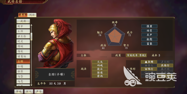 就武将属性而言,全琮是典型的全能型中坚武将。他的武力值是72,统帅值达到78,智力也达到了75,这样的数值说明他既可以指挥作战,又可以亲自上阵输出。速度45并不算好,但是成长率高,在后期培养中仍然有发展潜力。政治和魅力都一般般,不过在内政任务以及辅助玩法上仍然可以带来一定的收益。而且全琮的成长曲线很平缓,使他在各个时期都具备战斗力,不会出现前期强大后期衰退的现象。