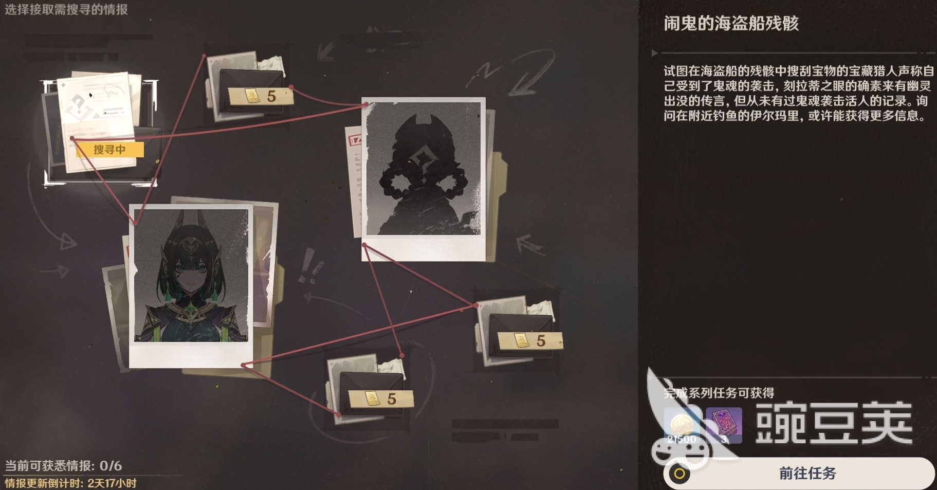 情报交易里的每个任务都需要用情报来进行兑换,每个任务的花费都是五情报,兑换后便开启相关的任务,可以点击前往任务快速进行追踪,同时会跳转到地图界面,方便人们去选择距离任务地点最近的传送锚点进行传送。若玩家兑换后没有第一时间去完成,可在做完其它事后,在任务里找到已经解锁但未完成的情报交易任务。
