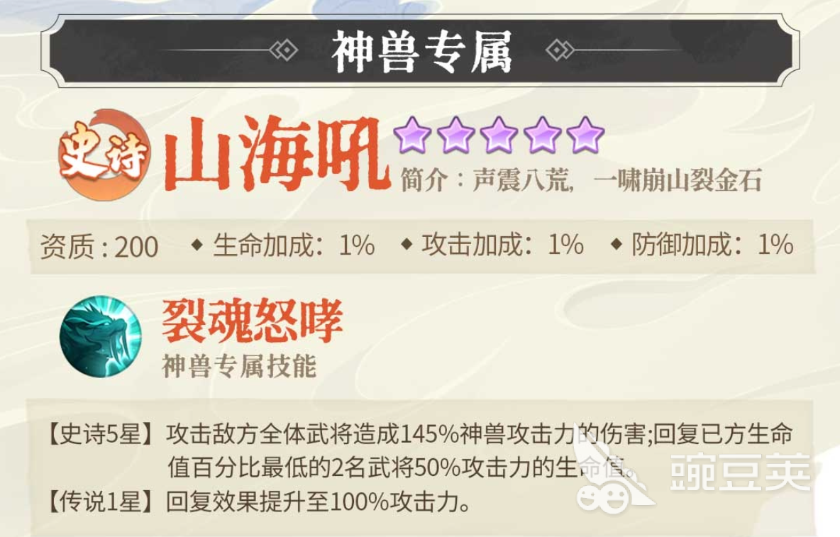 三国大冒险山海吼不仅仅实力是比较强悍的,他其实还融汇了历史典故,也有民间的传说,正是因为他作为一只神兽,战斗实力是比较强悍的,而他其实也具备文化内涵,能够帮助玩家在战斗的时候起到关键性的作用。