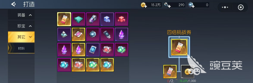 最后,我们来说说“其他”类的打造材料。这类材料包括四倍挑战券、高级强化纤维、强化保护剂和高级变换物质等。这些材料的作用是帮助你进一步提升装备的等级和属性。比如,四倍挑战券是由双倍挑战券和金币合成而成的,高级强化纤维则需要用强化纤维和金币合成。这些高级材料非常重要,打造高级装备时离不开它们。