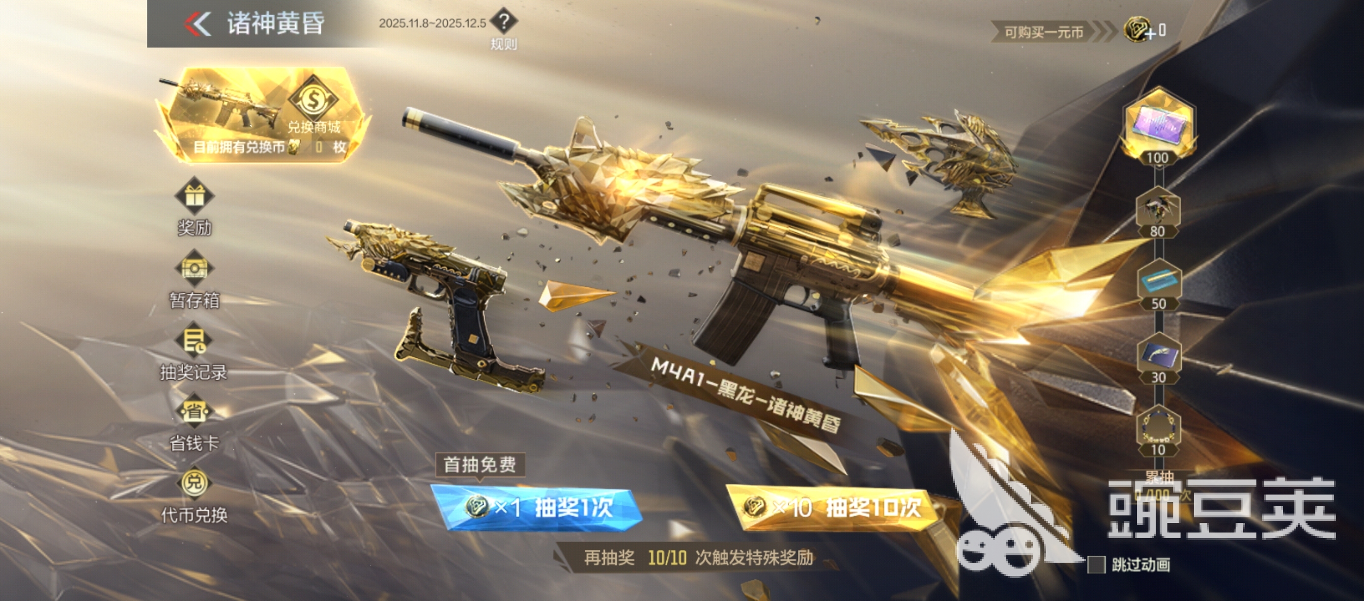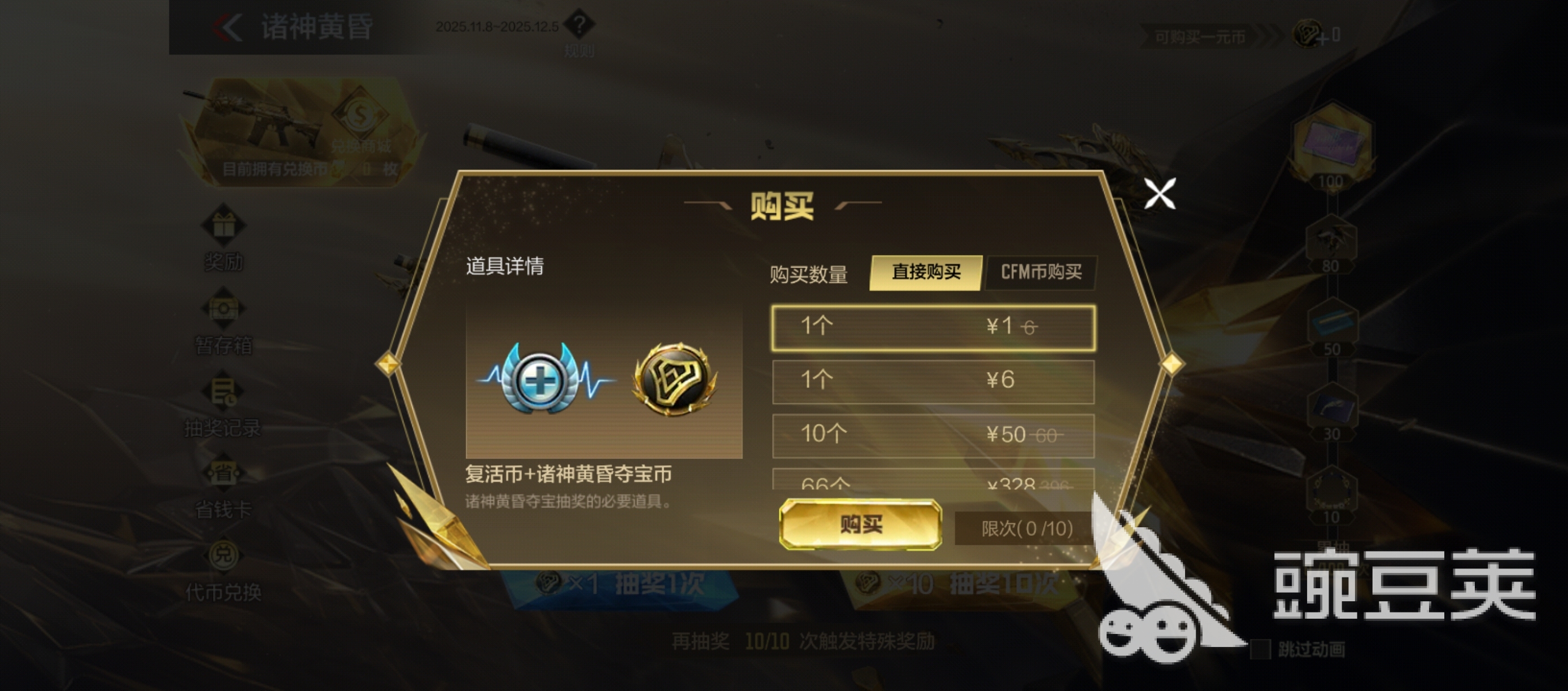 玩家在参加诸神黄昏夺宝的时候,需要了解,他其实通过抽奖的方式开展,而在抽奖的时候需要运用到代币,如果玩家单抽的话价格是6元,10连抽的价格是50元,目前部分商城还直接推出了一元购代币的优惠,所以玩家在选择抽奖之前,自己要决定是否要购买代币,毕竟在游戏当中,玩家其实是能够通过完成对应的任务来免费的获取代币。举个简单的例子,比如CFM币商城的20连抽福利,这样的话玩家其实就有机会低成本地获取代币。