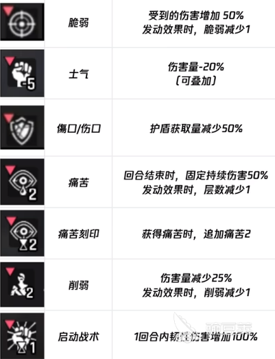 负面词条类指的就是减益的效果,其中包含5个属性,易伤类里面包括脆弱和痛苦,这两种属性可以让自己的角色遭受的伤害得到提高,并且会造成固定持续性的伤害,对角色的伤害力度是很大的。削弱士气类里面包括士气和削弱,这两个属性可以使伤害量减少1/4,但是发动时的效果层数将会减少一层。护盾限制类里面主要是以损坏这一属性为主的,这一属性将会使护盾的获取量减少50%。这样对护盾的伤害度将会降低一半。