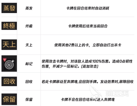 机制类词条就是根据不同的英雄,他们所拥有的战斗机制是不同的,例如卡牌机制里面主要是包括蒸发,终极以及回收,这三个属性对于卡牌的作用都是不同的,所以玩家需要根据战斗的情况而选择合适的卡牌机制。角色专属机制主要包括余烬、上膛以及狩猎启动,这些可以保护自己的角色,在受到伤害时能够减少伤害量,狩猎启动这一属性可以帮助自己的队友进行追加伤害。