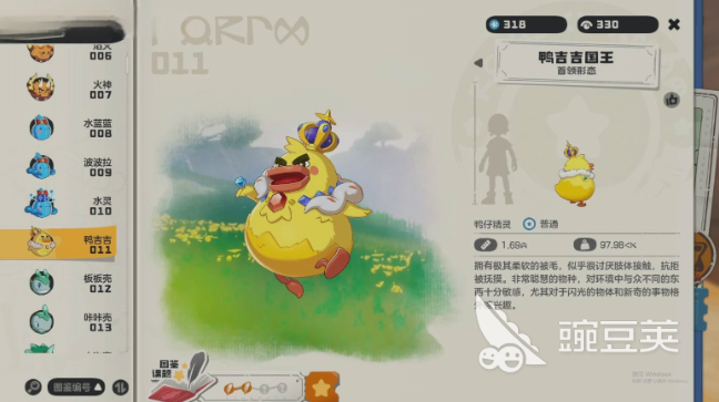 鸭吉吉常规的形态总共是三种,每一种都是比较可爱的。一开始身形比较小,头部有一些扁平,总是会有满满的活力。在蓬松形态下就会颠覆紧实感,有一个圆润饱满的体型,所以在行动这一方面看上去有一些笨拙,但是这软萌的样子还是会比较吸引人。在超进化之后就会变成首领形态,此时就是气场全开的鸭吉吉国王,想要解锁这一个常态,那自然就需要让他携带首领血脉,然后使用特定超进化的道具去完成激活,道具可以直接来到野外挑战活动去获取。