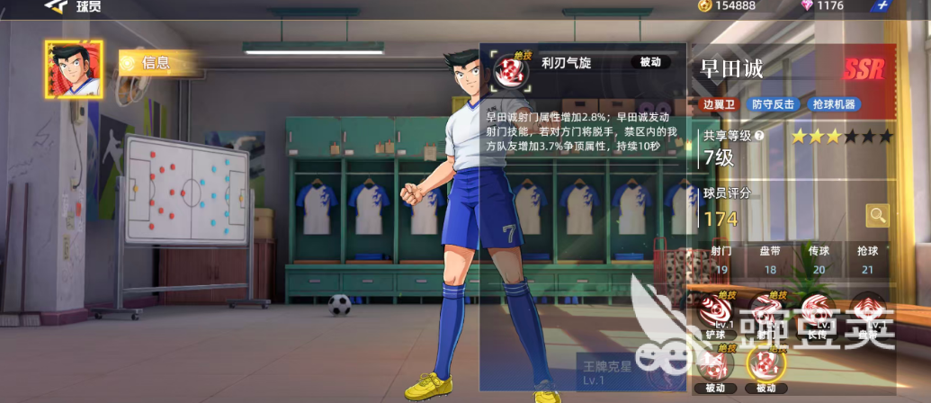最后的王牌克星这个技能相当于是一个大招的效果了,使用这个技能的时候让早田诚只要是在场内,此时对方球员如果发动了射门的动作,或者是抢点的动作,早田诚都会获得1层【王牌克星】的状态,那这个状态持续在他自己身上还是可以叠层的,这里最多的是后可以叠加起来3层的效果,这个增益配合上面的利刃打磨一起持续10秒的时间可以让他得到很大的优势,因为王牌克星的效果是降低16.8%的盘带属性,所以此时的优势也是体现在这方面的动作上。