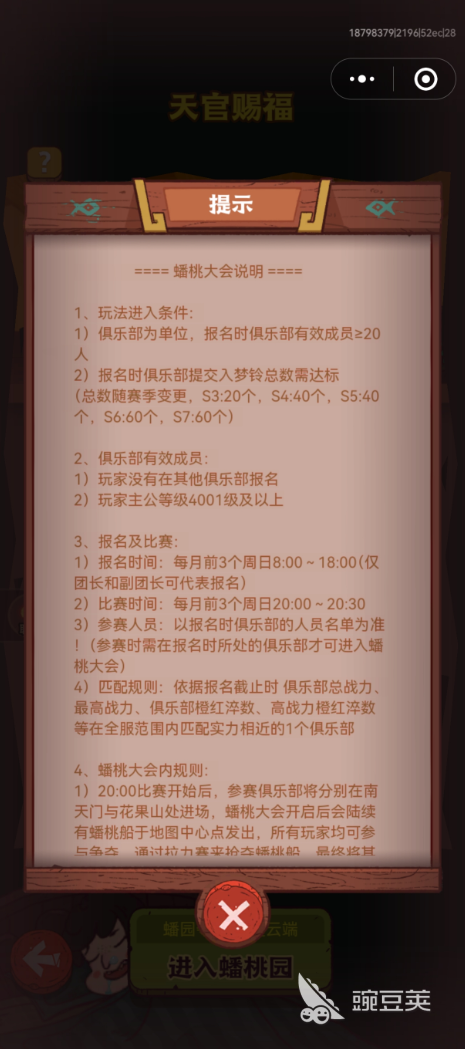 要参与蟠桃园活动,需满足一定的前置条件。首先,所属俱乐部成员人数必须达到至少20人,并在赛季开始时提交指定数量的陆梦玲作为报名资格。活动报名时间为每月前三个周日的早上8:00至下午18:00,在此期间由俱乐部管理员统一操作即可完成报名流程。正式比赛则安排在当晚8:00至8:30进行,每场对决持续30分钟。系统会随机匹配两个参赛俱乐部展开实时1v1对抗。比赛中,双方的核心目标是争夺蟠桃船的控制权,并将其成功运送至终点区域。通过这一过程累积积分,最终积分更高的队伍将赢得整场比赛胜利。