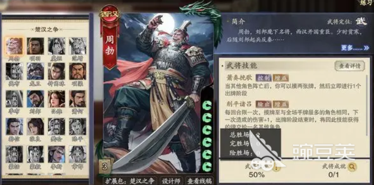 第一个为大家推荐的就是周勃,周勃这张卡牌他在摸牌的能力上面就有足够的加伤效果,而且周勃本身的体力数值就是比较稳定的,他在技能1的效果上面是出牌阶段就可以得到足够的优势,此时可以弃置自己手中一些手牌,而且数量是自由认定的,并且此时他还可以找到其中的一位队友来弃置同样数量的卡牌,回合结束之后,如果这个目标造成输出的话,大家也可以根据他的输出卡牌去获取同样的双牌,所以这波他目前摸牌的数量上面非常高。