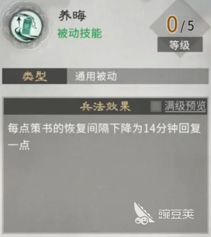 后期如果大家想要进行恢复效果的话,那么这里还可以使用一个战法叫做养晦,养晦这个战法可以加快大家在技能回复这个效果上面的,而且是自然恢复速度上面会有一定的提高,所以如果他想要战斗里面技能的使用频率更高的情况下,用这个养晦兵法带来的提升效果是最强的,如果他是休闲类型的玩家,这里的话可以选择的兵法是木影。