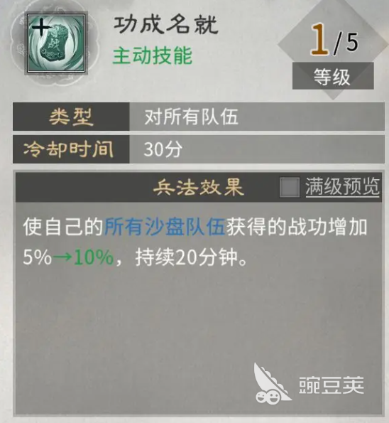 其次还有一个比较推荐的是功成名就兵法,这个兵法的话,它就可以让大家前期快速积累起来足够的战功,这样在中期或者是后期大家刷榜的情况下就可以用起来,而且前中期如果大家参与的战斗比较频繁的情况下,利用这个功成名就的兵法,大家可以获取更多的资源,相对前期来说,大家用到的技能效果就会更强一些,所以功成名就如果是大家喜欢玩儿双榜,又喜欢得到足够的战局搭配的情况下,它就非常好用。
