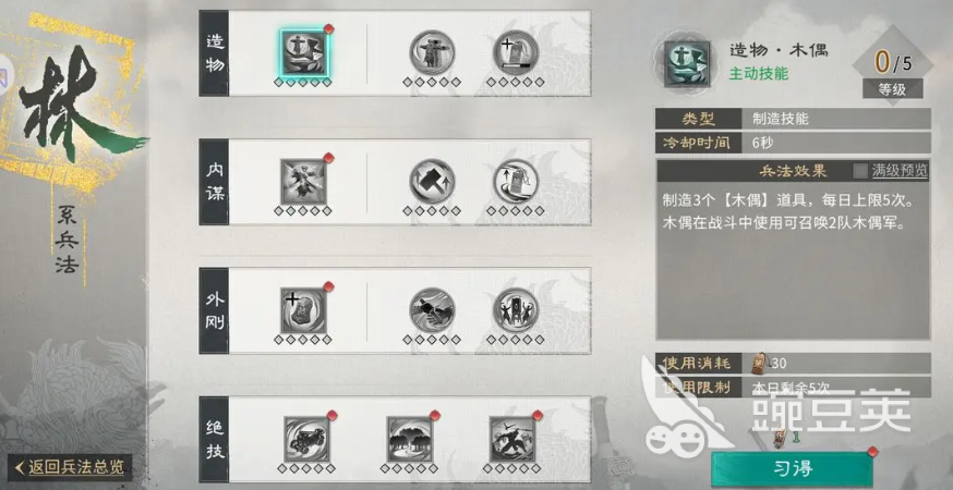 如果是平民玩家的话,这里可以选择兵法效果第一个推荐造物,造物这个并发效果在非战斗的状态下,大家可以持续积攒道具,而且在守城战里面造物这个兵法,它可以为我方阵容里面添加两对木偶假人,大家就可以看作是士兵,主要用来吸引敌人的攻击,而且还可以削弱此类敌人的实际效果,所以造物这个兵法的话,目前用处非常多,可以搭配的情况也不少,作为平民玩家的话,用这个战法可以带来的优势有非常多。